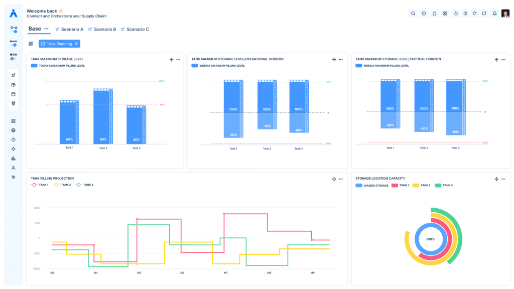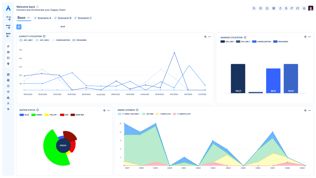 A clear, user-friendly, and adaptable layout enables planners to easily assess and plan their relevant scenarios. Visual comparison functionalities, real-time calculated key performance indicators, and data-sharing features allow an informed decision throughout the complete supply chain.