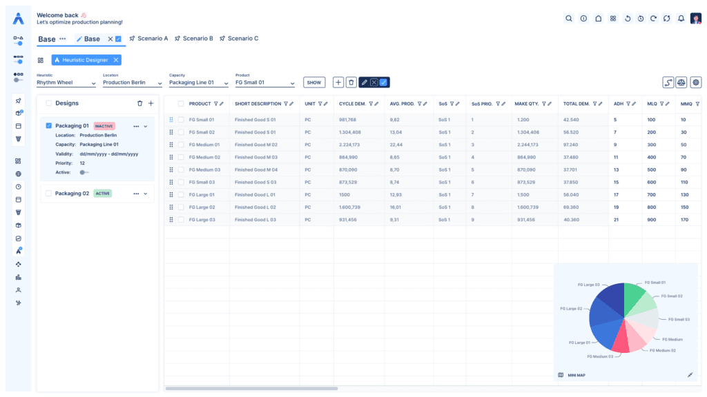 BOM component availability is ensured during automated and manual scheduling to ensure a feasible production plan. Smart heuristics create a finished good plan, where all components are available, while idle times on the line are still minimized.